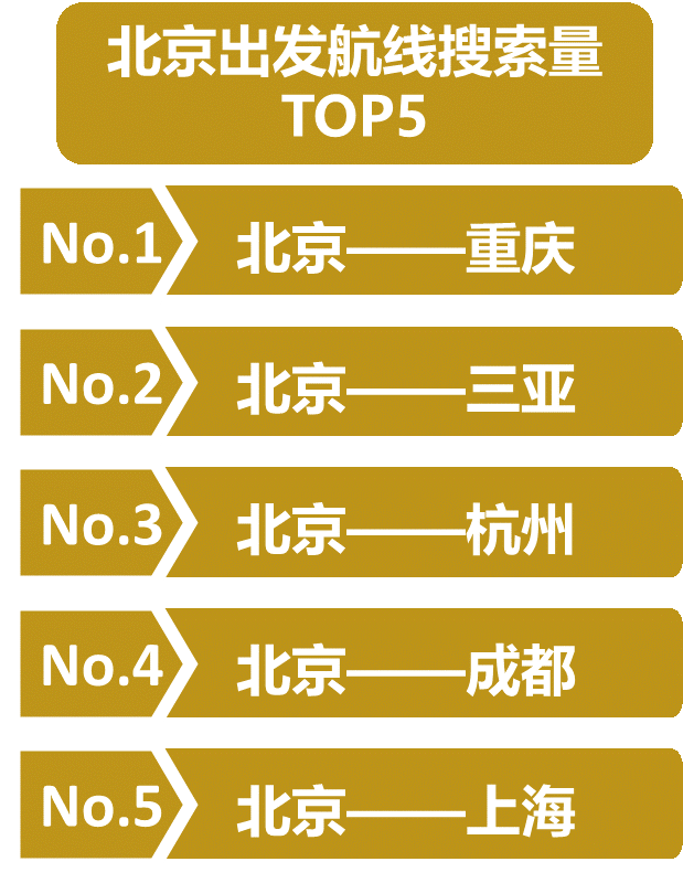 中智游集团综合去哪儿、航班管家平台数据,达到北京航线搜索量以上海、深圳、广州等南方城市居多;同样,北京航线出发搜索量也以南方城市居多,排名前五的城市为重庆、三亚、杭州、成都、上海等。