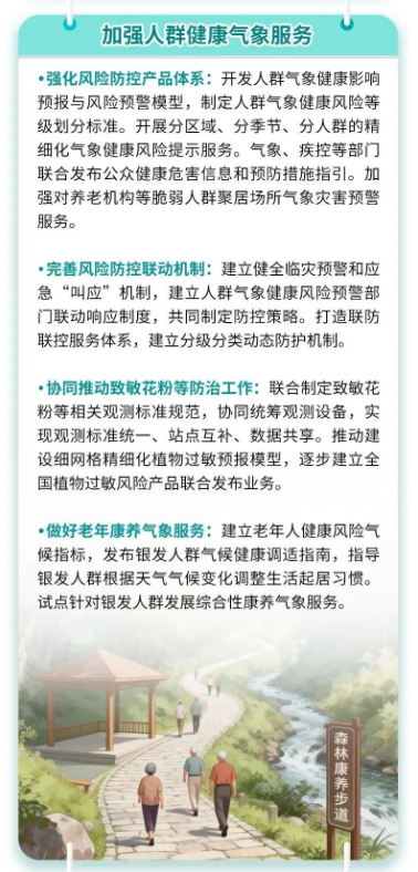 中国气象局、民政部、文化和旅游部、国家医保局、国家林业和草原局、国家中医药管理局、国家疾病预防控制局等七部门近日联合出台《关于加强协同联动推进康养气象服务高质量发展的指导意见》。