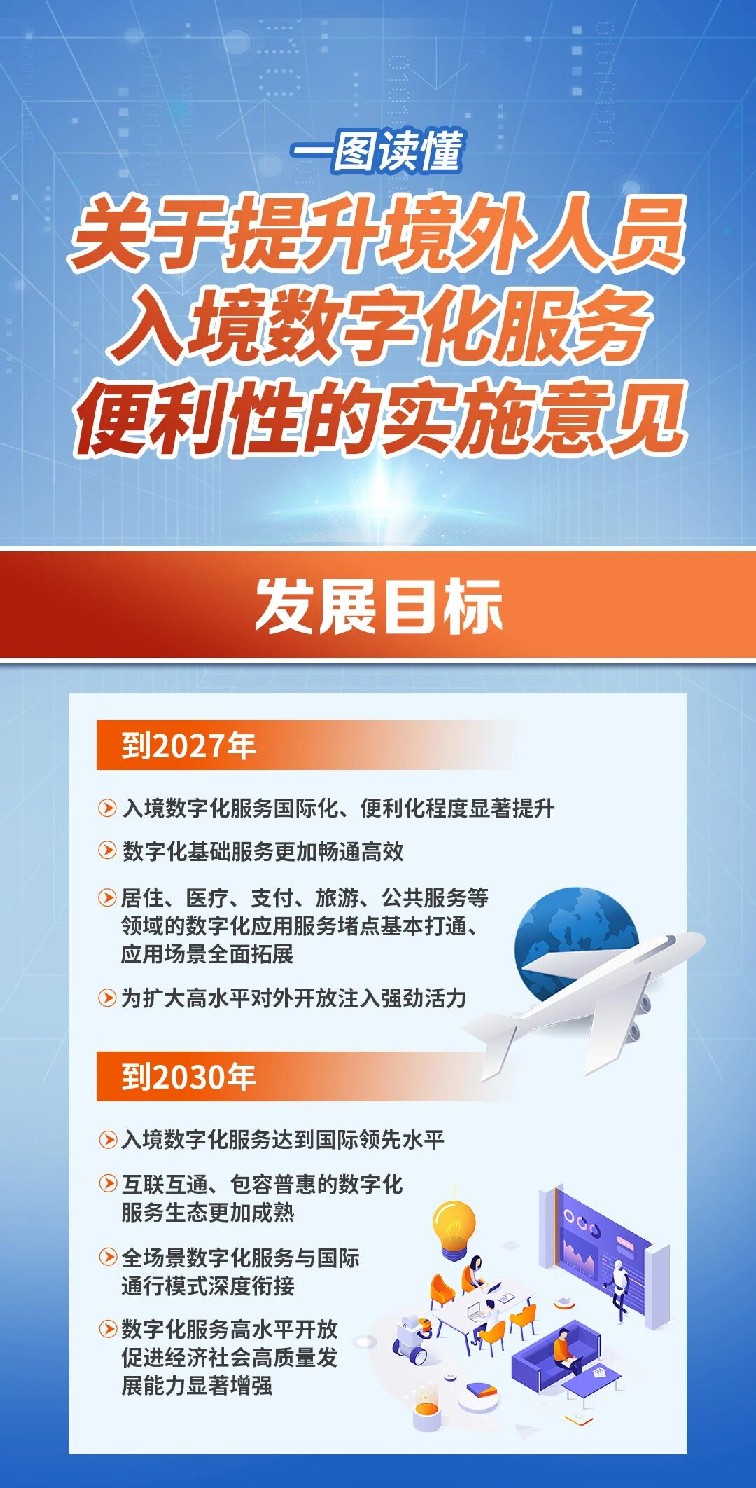 到2027年,入境数字化服务国际化、便利化程度显著提升,数字化基础服务更加畅通高效,居住、医疗、支付、旅游、公共服务等领域的数字化应用服务堵点基本打通、应用场景全面拓展,为扩大高水平对外开放注入强劲活力。