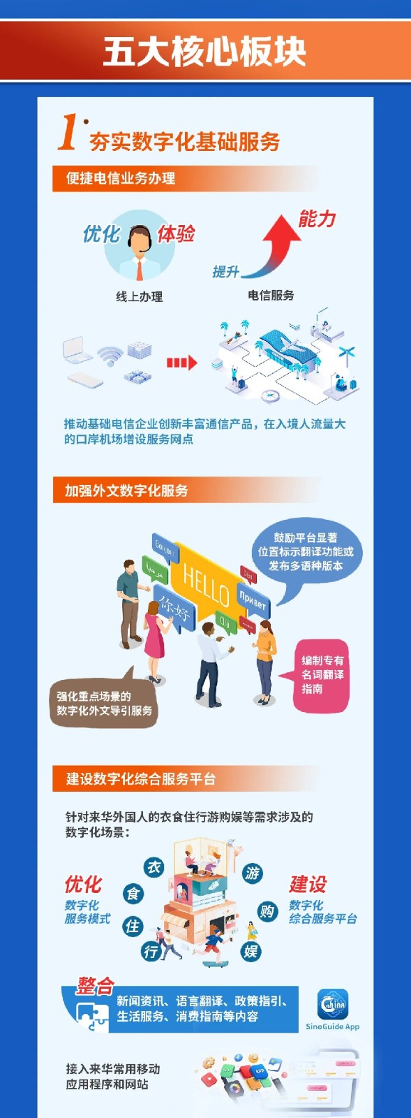 3.建设数字化综合服务平台。针对来华外国人的衣食住行游购娱等需求涉及的数字化场景,优化数字化服务模式,建设数字化综合服务平台,整合新闻资讯、语言翻译、政策指引、生活服务、消费指南等内容,接入来华常用移动应用程序和网站。