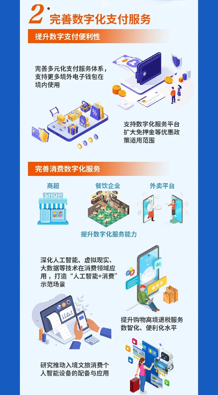 5.完善消费数字化服务。引导商超、餐饮企业和外卖服务平台提升数字化服务能力,优化境外人员购物、就餐等消费体验。深化人工智能、虚拟现实、大数据等技术在消费领域应用,打造一批“人工智能+消费”典型示范场景。推动离境退税线上办理,提升购物离境退税服务数智化、便利化水平。研究推动入境文旅消费个人智能设备的配备与应用。