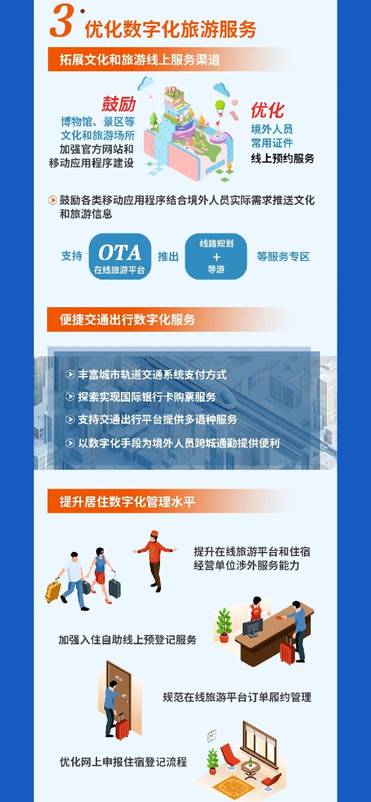 8.提升居住数字化管理水平。提升在线旅游平台和住宿经营单位涉外服务能力,加强入住自助线上预登记服务,简化信息采集。规范在线旅游平台订单履约管理,推动境外人员入住流程规范化、透明化、标准化。优化网上申报住宿登记流程,便利境外人员在旅馆以外居住办理登记。