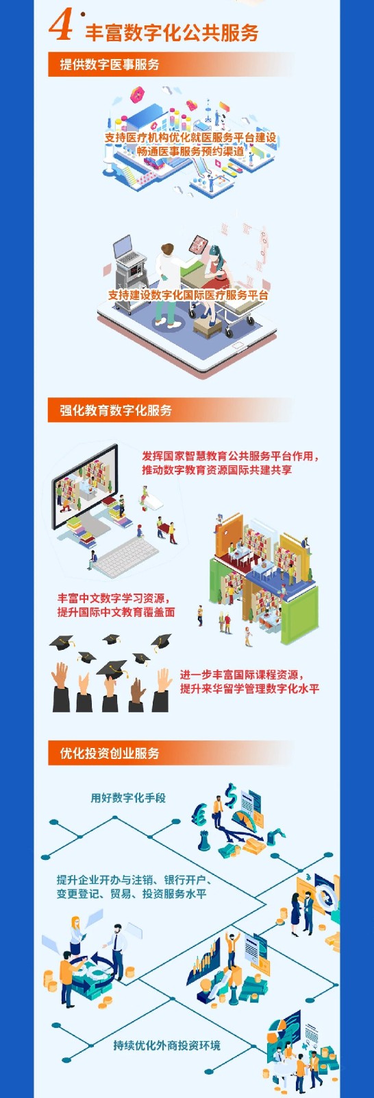 11.优化投资创业服务。用好数字化手段,提升企业开办与注销、银行开户、变更登记、贸易、投资等服务水平,持续优化外商投资环境。